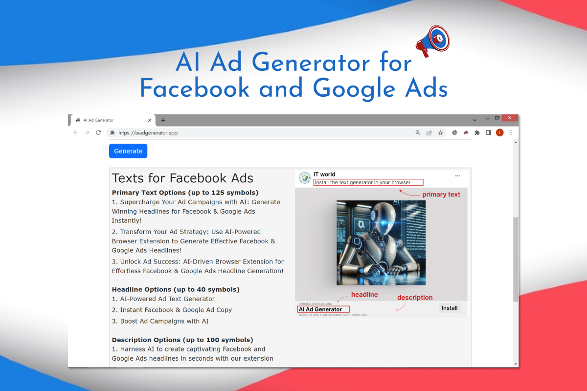 Welcome to the future of advertisements with AI Ad Generator β the ultimate ad maker for Facebook Ads and Google Ads! Ever felt stuck while crafting the perfect ad copy? Or maybe, you just want to improve your advertising game? Well, we have just the solution for you! With state-of-the-art AI technology, our advertisement maker can transform your marketing strategies. π‘